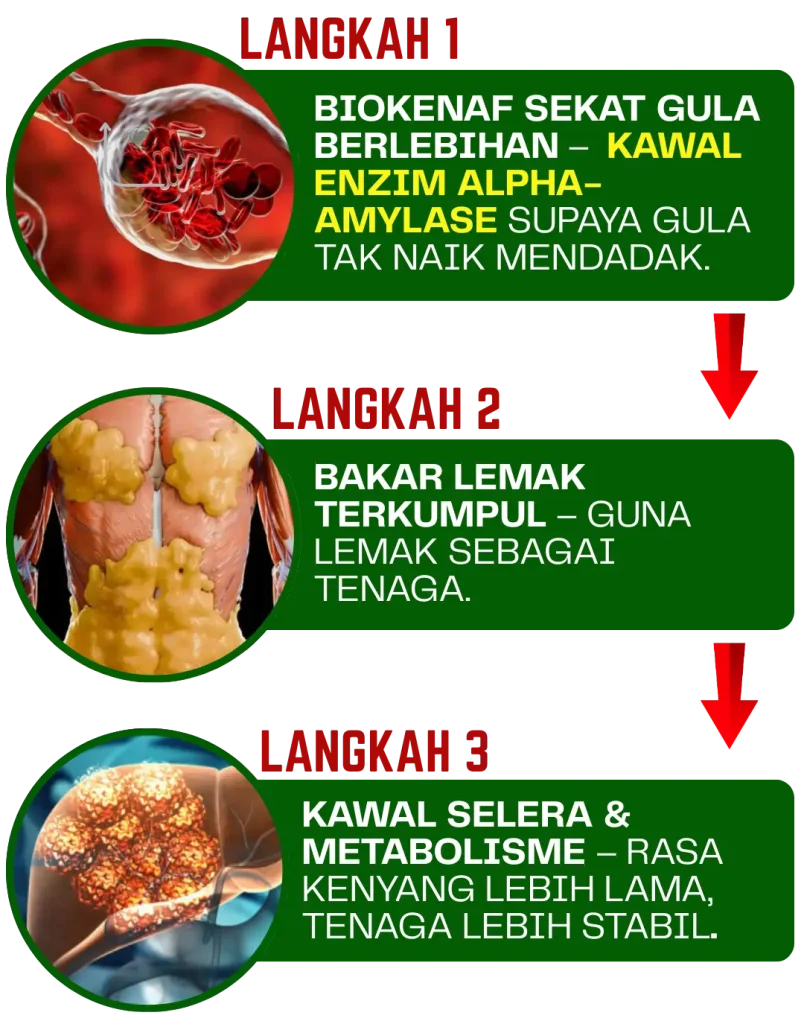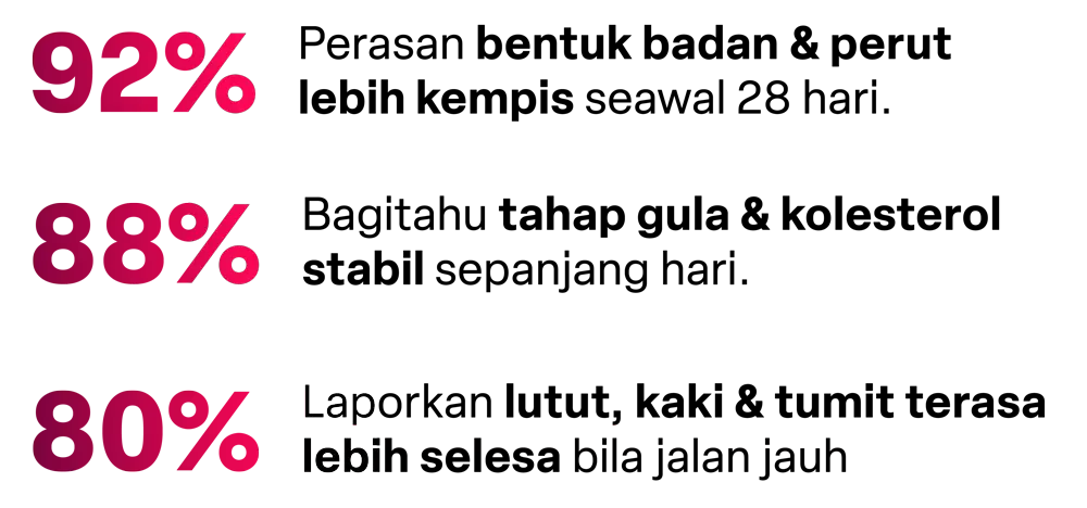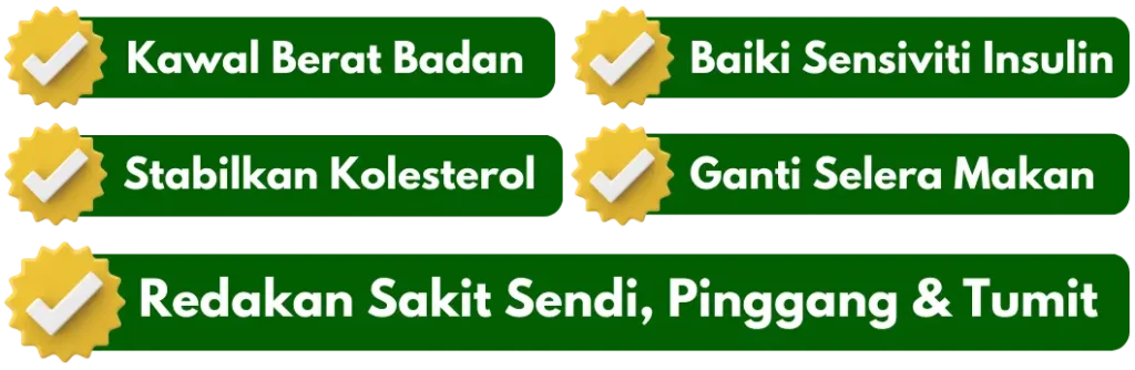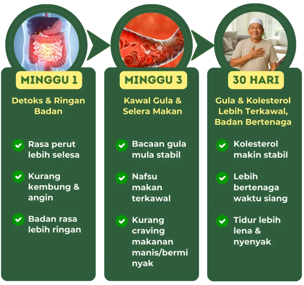 👉 Ramai pengguna mula rasa perubahan seawal minggu pertama – badan lebih ringan & selesa. Untuk kawalan gula, kolesterol & sakit sendi biasanya nampak ketara selepas 3–4 minggu penggunaan konsisten.