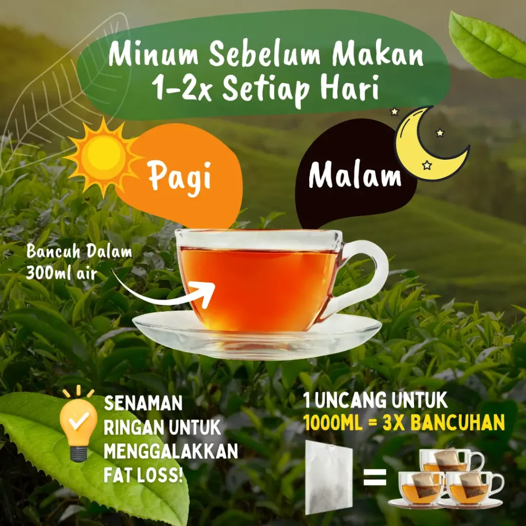 👉 1 uncang boleh dibancuh dengan 1000ml air (boleh ulang 3–4 kali bancuhan). Disarankan minum sebelum makan atau sebelum senaman ringan.