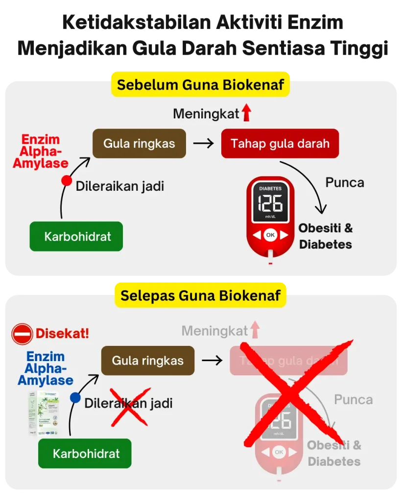 “Alpha-amylase ialah enzim yang pecahkan karbohidrat kepada gula. Pada individu obes, enzim ini tidak stabil, menyebabkan selera makan, gula dan lemak darah sentiasa tinggi serta susah turun berat.”