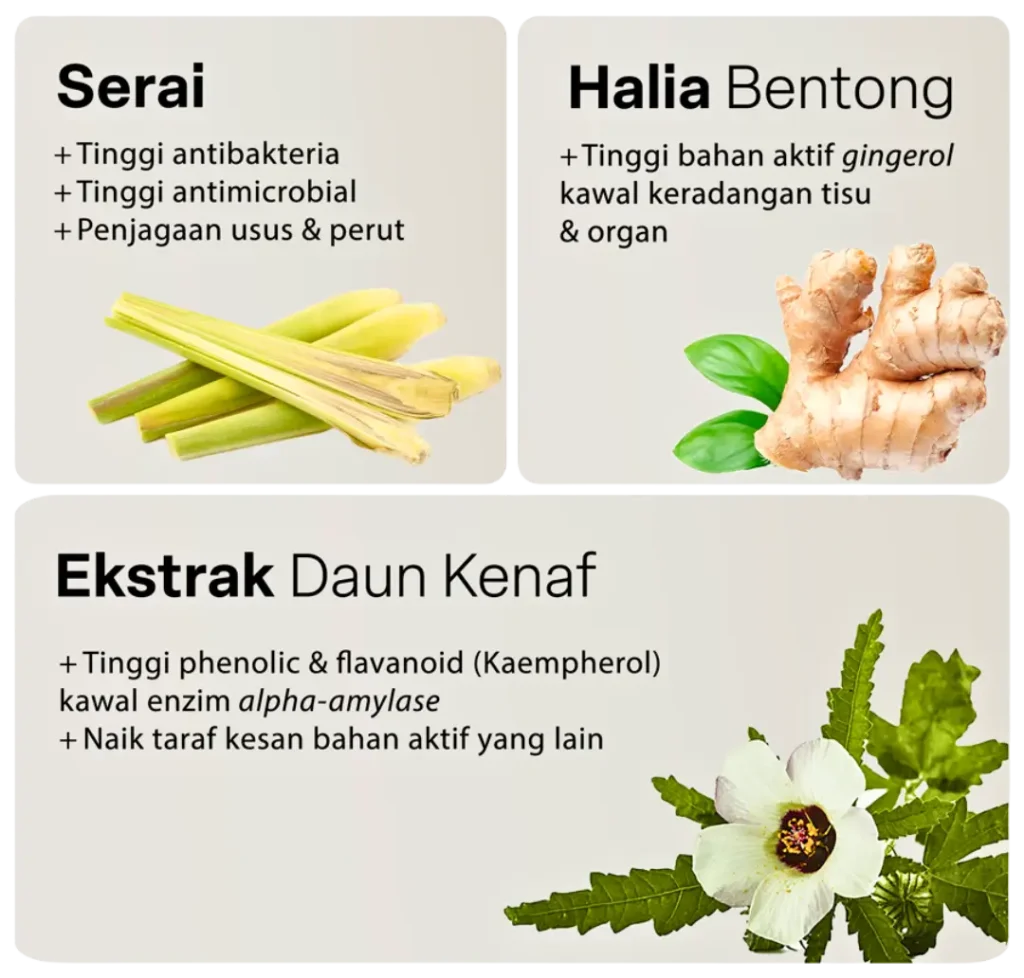 Diformulasi khas daripada ekstrak daun kenaf, serai & halia Bentong